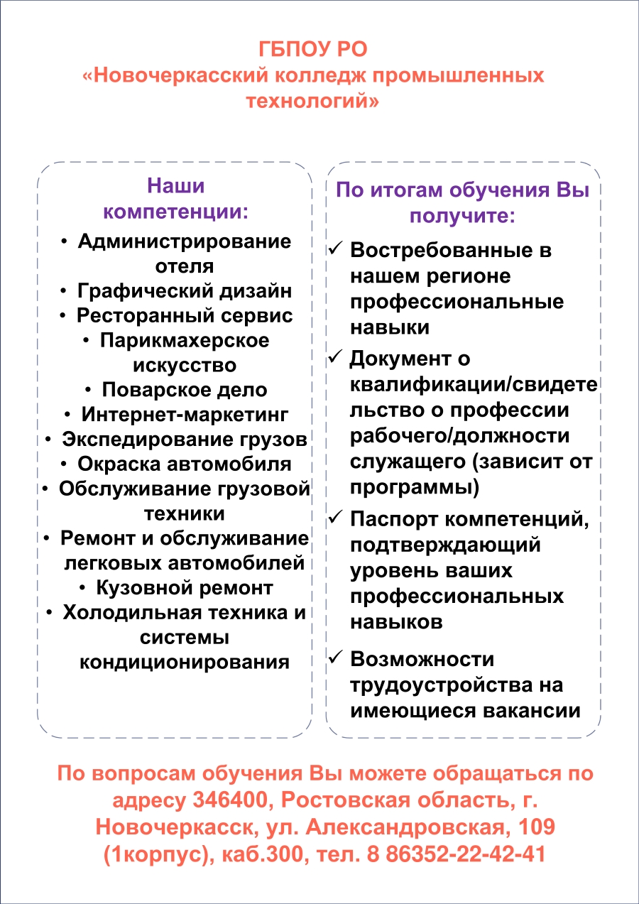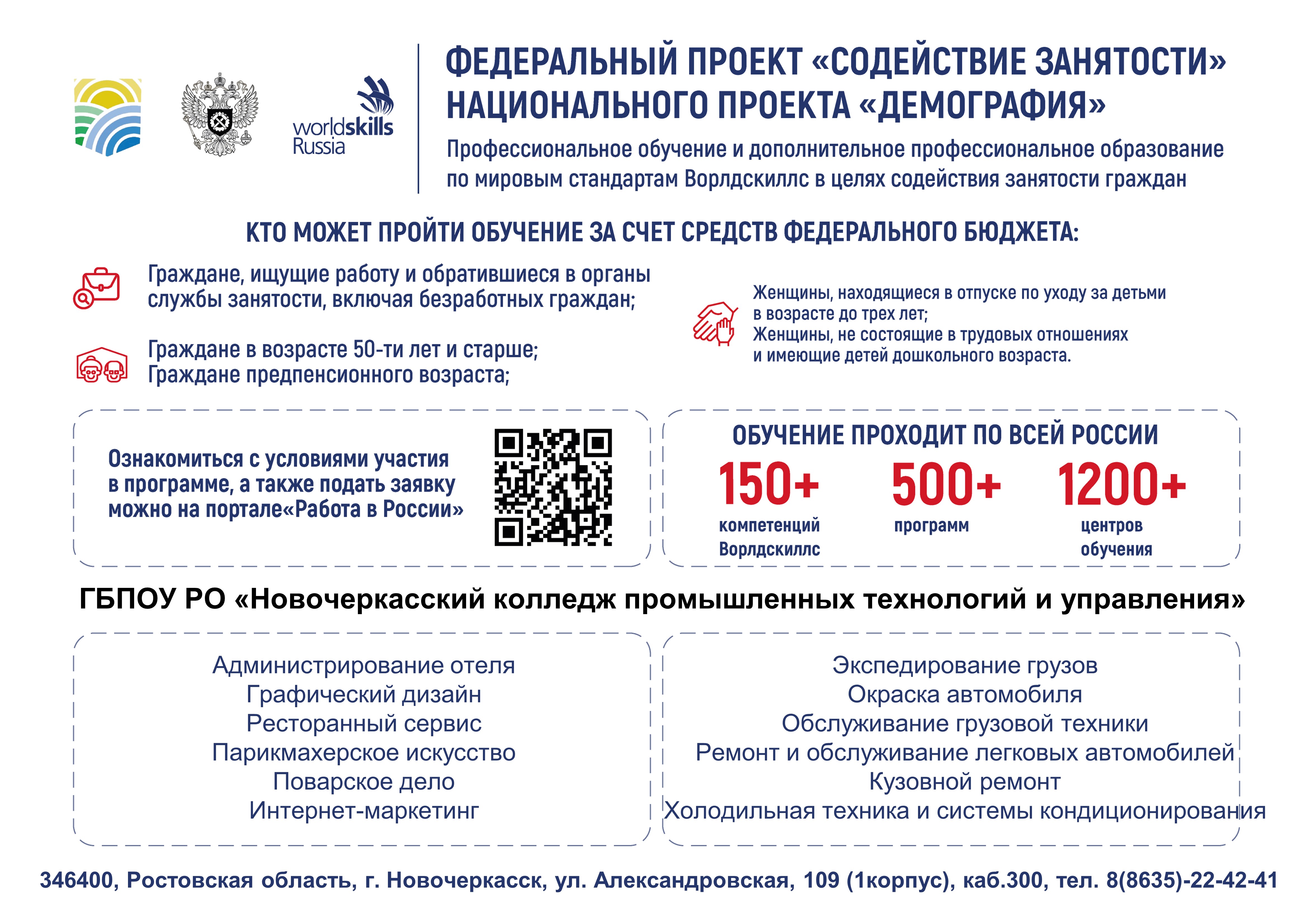 Стартовал федеральный проект «Содействие занятости» национального проекта «Демография». Администрация колледжа приглашает заинтересованных лиц пройти обучение. По вопросам регистрации и подачи заявок обращаться в отдел практичсекого обучения и дополнительного образования: каб. 300 (1 корпус), тел. 8 (8635) 22-42-41