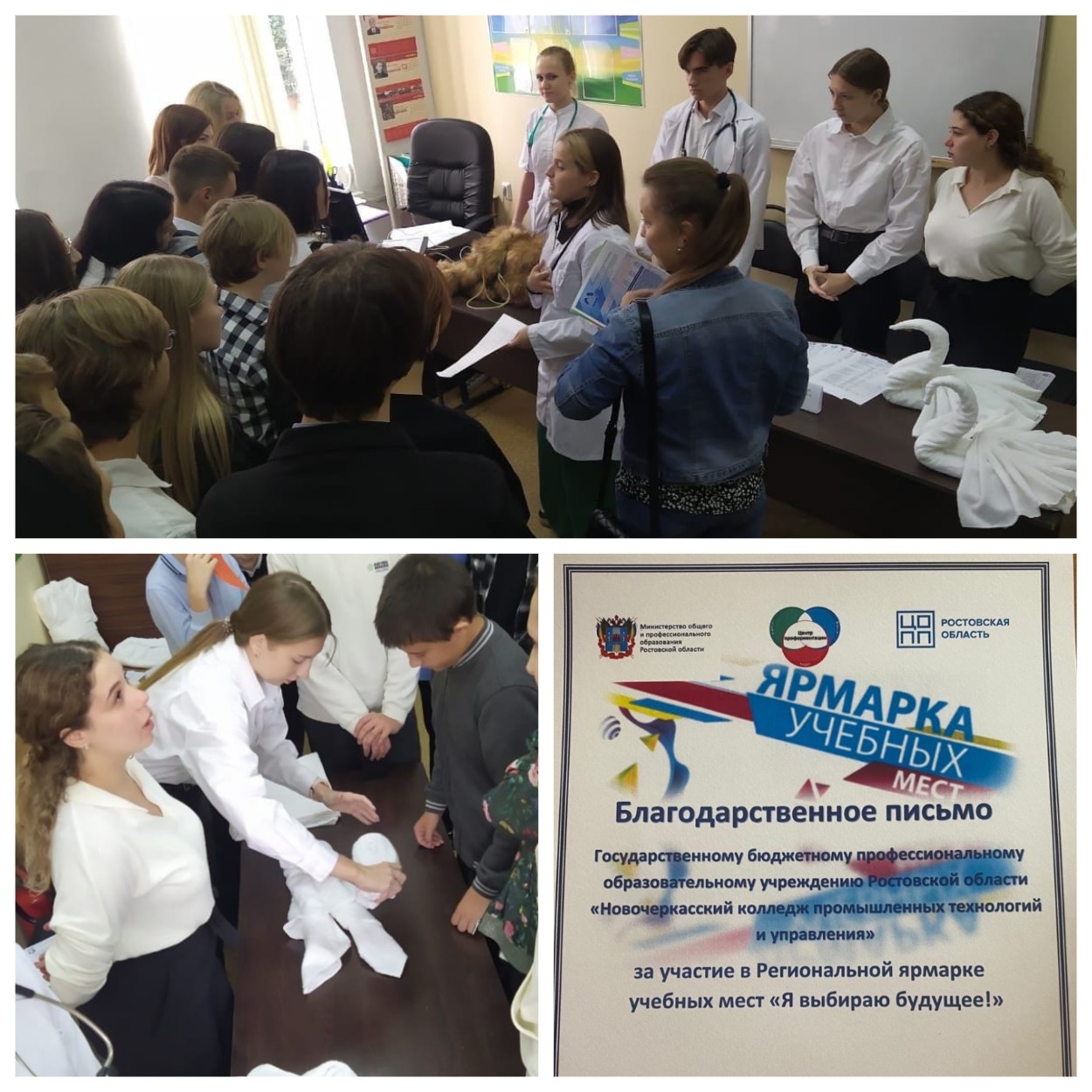 Для участников ярмарки преподаватели Нина Лавренко и Ольга Кривошеева вместе со своими студентами провели мастер-классы. Ветеринары показали процесс сердечно-легочной реанимации собаки на пушистом манекене. Будущие специалисты гостиничного дела научили всех желающих быстро и красиво сворачивать лебедей из полотенец.