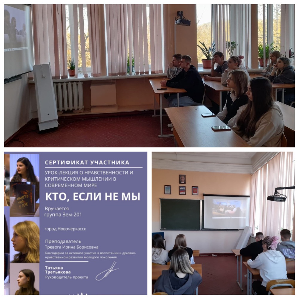 8 ноября в группе ЗЕМ-201 состоялся мотивирующий цифровой урок-лекция о нравственности и критическом мышлении в современном мире. Провела мероприятие преподаватель Ирина Тревога.