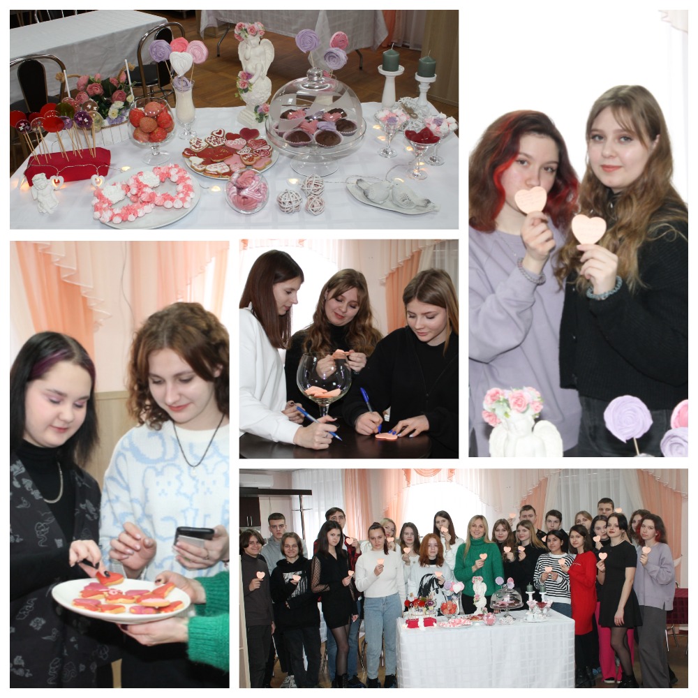 Вместе с преподавателем Татьяной Скоба ребята своими руками сделали тематический кандибар и приготовили сладости. Во время мероприятия студенты обменялись друг с другом милыми записками с комплиментами и угостились кондитерскими изделиями.