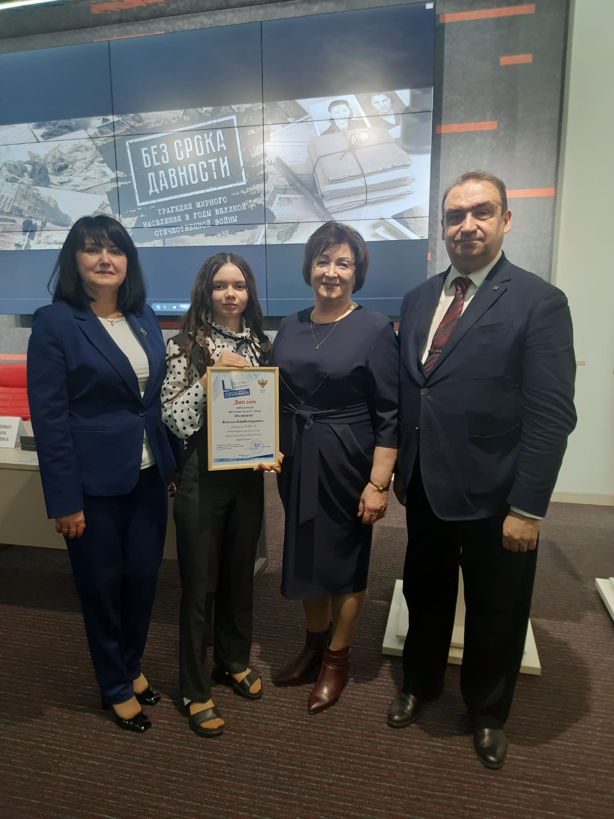 Диплом победителя регионального этапа конкурса сочинений «Без срока давности» среди студентов СПО Ростовской области вручила заместитель министра общего и профессионального образования Ростовской области Тамара Шевченко. Она пожелала Ксении больших успехов в достижении новых свершений.