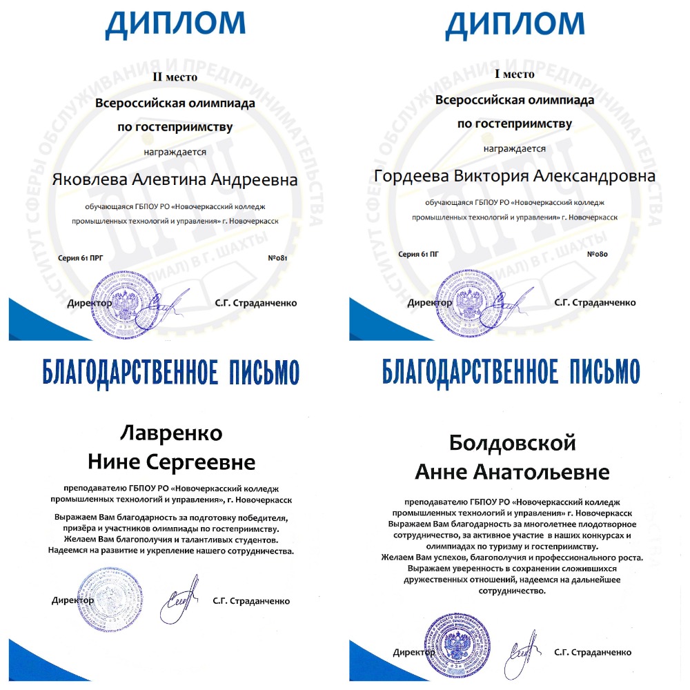 Ежегодно будущие специалисты индустрии гостиничного сервиса принимают участие во Всероссийских олимпиадах, организуемых кафедрой «Сервис, туризм и индустрия гостеприимства» совместно с отделом профориентации и поддержки талантливой молодежи Института сферы обслуживания и предпринимательства (филиала) «Донского государственного технического университета» в г. Шахты и ООО «Актив-сервис» ресторанно-гостиничным комплексом «Замок».