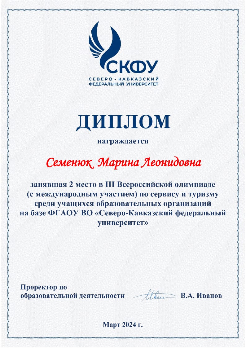 Интеллектуальное состязание проводилось в индивидуальном и командном формате в два этапа. Студентки Виктория Гордеева, Виктория Дронова, Марина Семенюк и Алевтина Яковлева успешно прошли первый отборочный этап (индивидуальное участие – эссе), по итогам которого получили сертификаты и были приглашены на второй этап - тестирование на знания и навыки в сфере туристической и сервисной деятельности. В итоге призёрами олимпиады в разных номинациях стали Виктория Гордеева и Марина Семенюк.