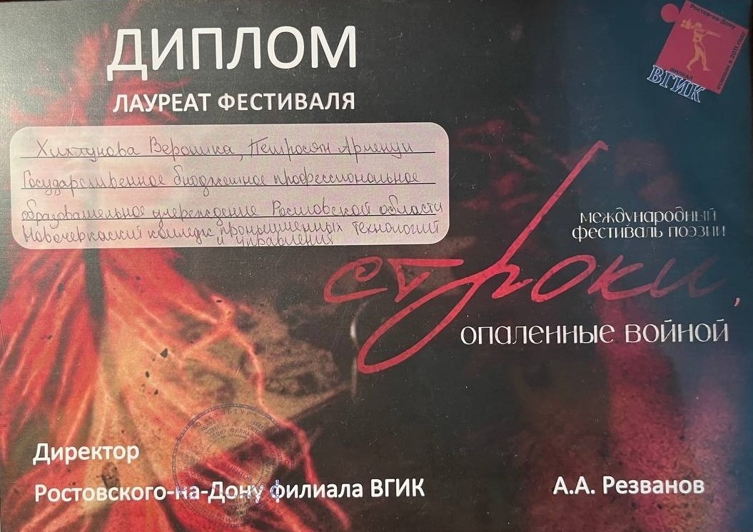 В преддверии Великой Победы прошёл I Международный литературный фестиваль «Строки, опалённые войной...». Студентка НКПТиУ Вероника Хихлунова стала лауреатом фестиваля.