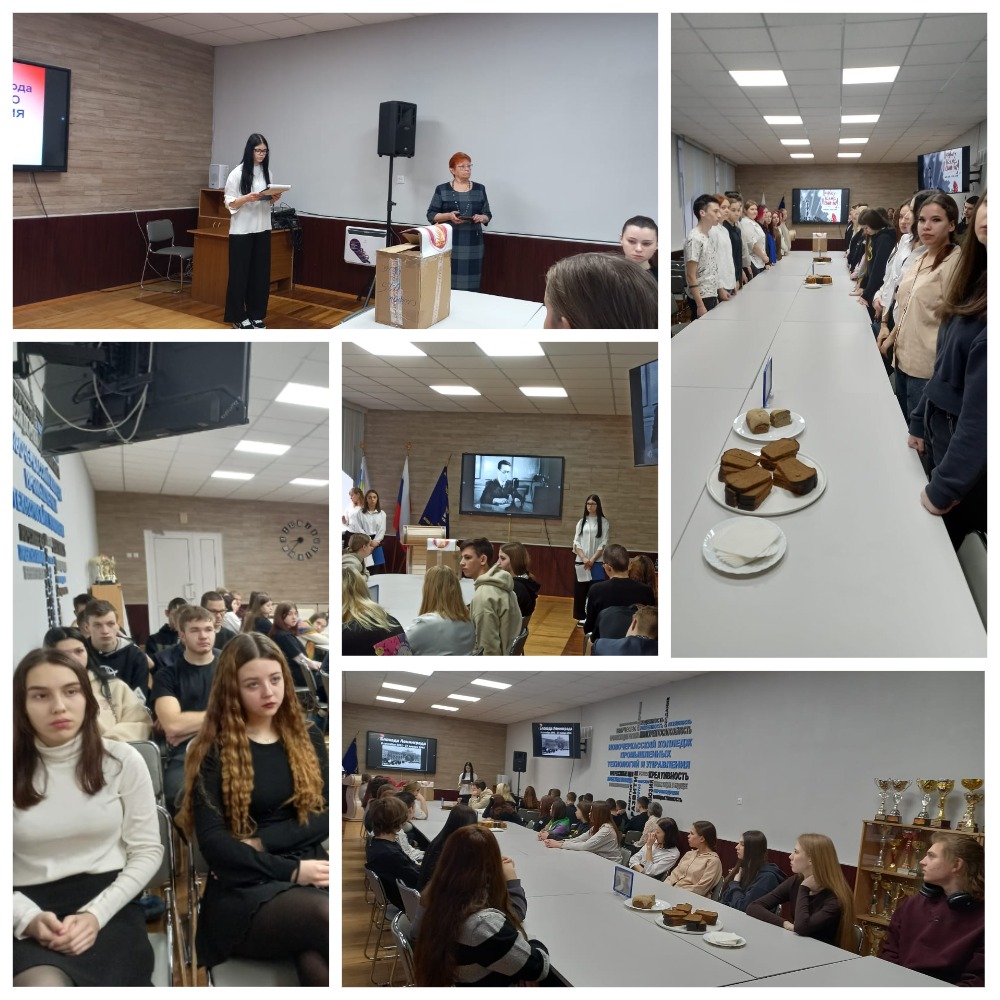 Студенты прочли стихи и посмотрели видео, посвящённые тому ужасному времени: воспоминания об объявлении войны, снятии блокады, выпечке блокадного хлеба, который в те годы считался самым ценным. А также организовали демонстрацию и дегустацию блокадного хлеба, который испекли ребята.