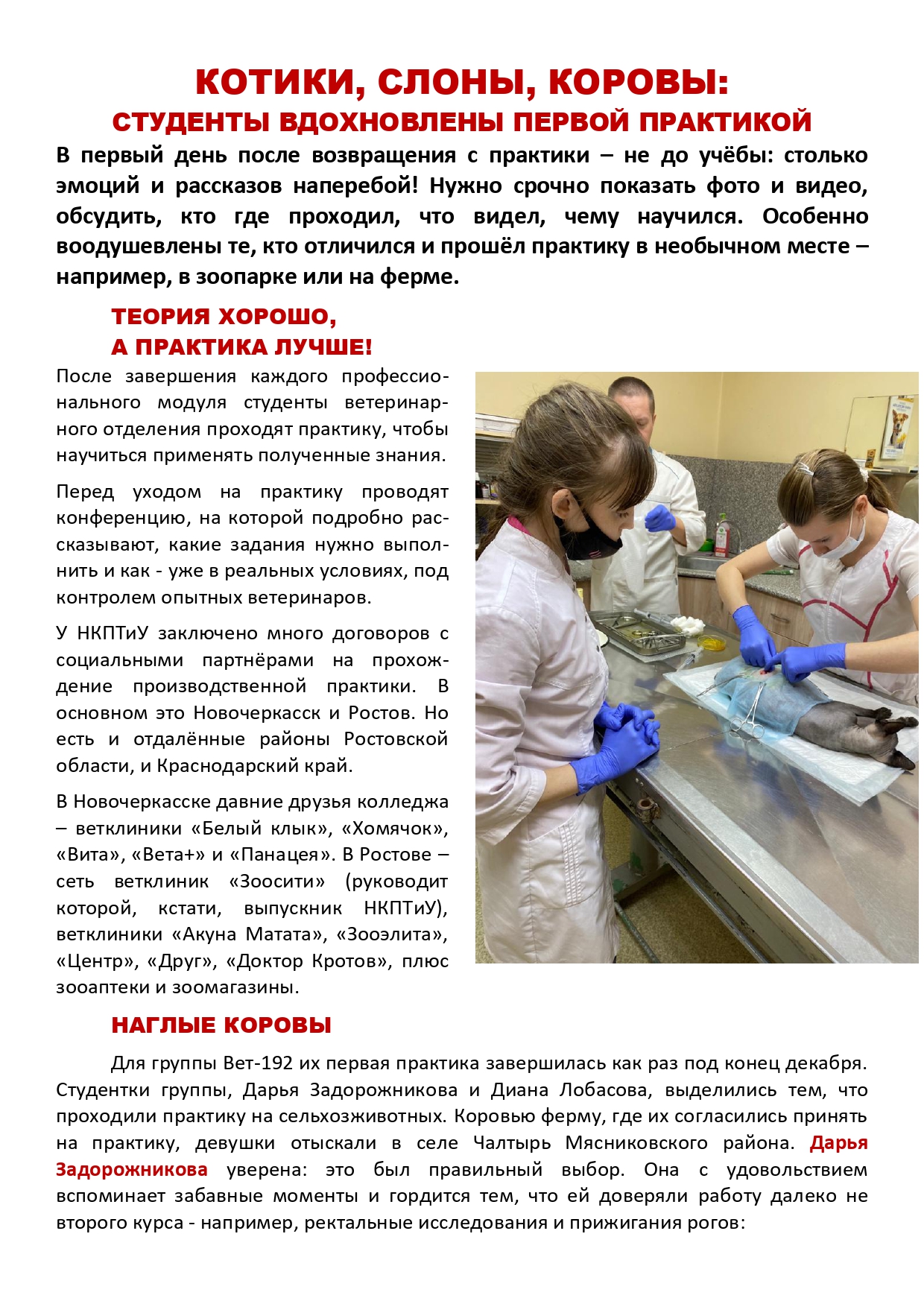 В первый день после возвращения с практики – не до учёбы: столько эмоций и рассказов наперебой! Нужно срочно показать фото и видео, обсудить, кто где проходил, что видел, чему научился. Особенно воодушевлены те, кто отличился и прошёл практику в необычном месте – например, в зоопарке или на ферме. ПОДРОБНЕЕ....