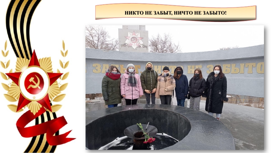10 февраля 2021 года рамках месячника военно-патриотической работы группа Зем-201 (классный руководитель Тревога И.Б.) Агротехнического отделения посетила мемориальный комплекс Курган Славы города Новочеркасск в Александровском парке, на бетонной полусфере которого и увековечены металлические буквы со словами «Никто не забыт, ничто не забыто!». Классным руководителем Тревога И.Б. для обучающихся предоставлена информация об истории и символике этого комплекса, о статистических данных по потерям новочеркассцев в годы Великой Отечественной войны. После студентами были возложены цветы в знак памяти воинам-героям, отдавшим свои жизни во имя Родины! Мы помним! Мы гордимся!