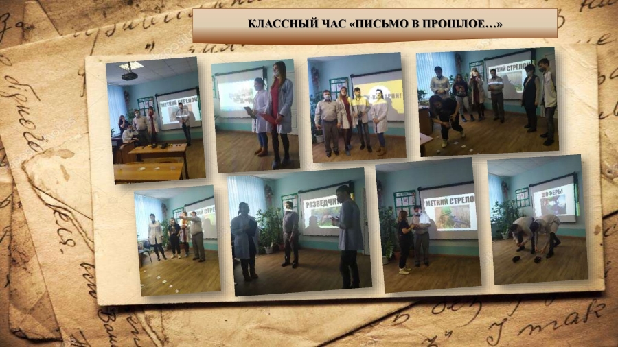 12 февраля 2021 года в рамках месячника военно-патриотического воспитания в группе Вет-192 (классный руководитель Кривошеева О.Н.) Агротехнического отделения прошёл открытый тематический классный час «Письмо в прошлое…». Обучающиеся напомнили о тех суровых и трагичных буднях, которые погрузили нашу Родину в годы войны. Студенткой группы Тарасенко А. было прочитано написанное ею «Письмо в прошлое», посвящённое её прадедушке Дулькину И. В., прошедшему всю Великую Отечественную войну от Ростова до Берлина. Далее для мужчин-преподавателей отделения были подготовлены конкурсы. Участие студентов в данном мероприятии способствовало развитию их творческих способностей. Результатом явились особая атмосфера, пронизанная духом патриотизма, а также положительный эмоциональный настрой студентов и приглашенных гостей. В заключение отметим, сколько бы ни прошло времени, значение подвига нашего народа в Великой Отечественной войне никогда не уменьшится, и слава героев тех времён тоже не померкнет…