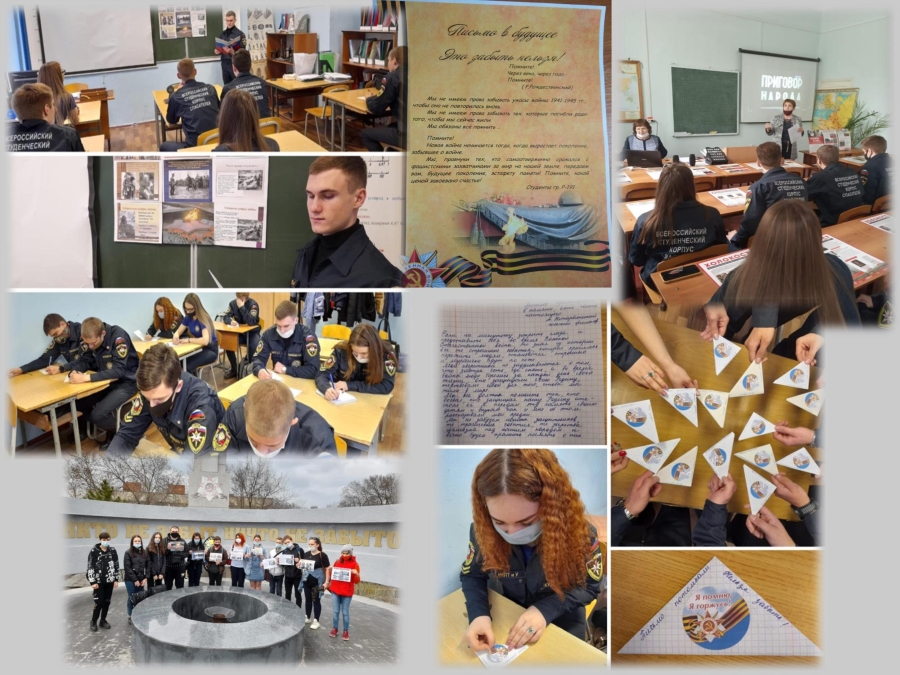На уроках русского языка и литературы студенты под руководством преподавателей написали Письма в будущее «Нельзя забыть», в которых было послание самому себе и своим потомкам в форме треугольного (военного) письма. Вот выдержка из письма Кривенцовой Елены, студентки гр. ГД-201 К вам обращаемся мы, правнуки тех, кто много лет назад прошел через пламя войны и водрузил Знамя Победы над поверженным Рейхстагом.