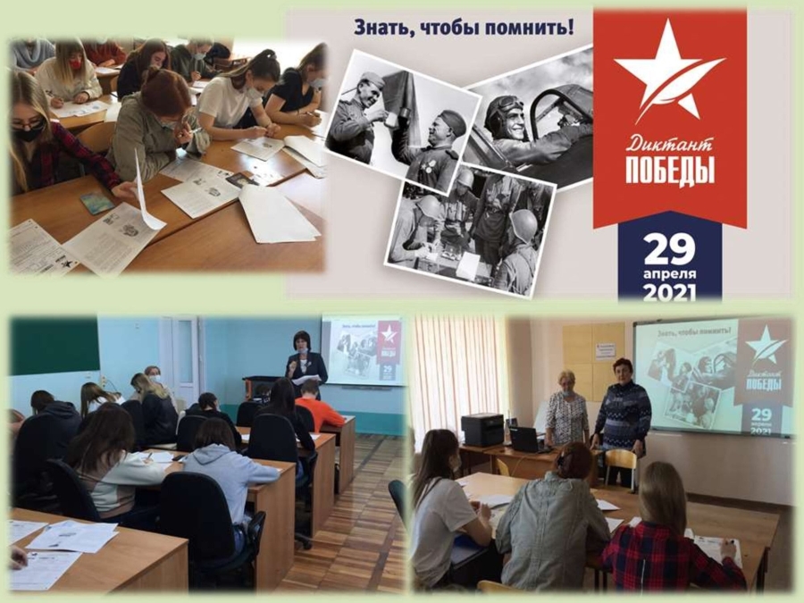 29 апреля 2021 года студенты Новочеркасского колледжа промышленных технологий и управления приняли участие в международной патриотической акции «Диктант Победы». Диктант - условное название, скорее, это был тест. Участникам акции предстояло выполнить 25 заданий, где они проверили свои знания военной истории России. Задания касались самого широкого спектра вопросов, начиная с хода боевых действий, положения на фронтах и заканчивая достижениями советской науки и промышленности тех лет, часть вопросов была посвящена преступлениям гитлеровцев против мирных граждан СССР. На организованной в колледже площадке была особая атмосфера – звучали песни и стихи военных лет.