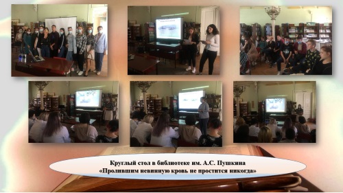 10 сентября 2021 года к Международному дню памяти жертв фашизма Центр краеведческой и муниципальной информации ЦГБ имени А. С. Пушкина, ГКУ РО «Государственный архив Ростовской области» и ГБОУ РО «Новочеркасский колледж промышленных технологий и управления» провели заседание круглого стола «Пролившим невинную кровь не простится никогда».
