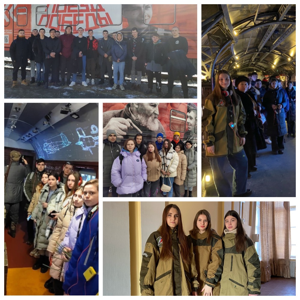 9 февраля, в первый день прибытия поезда в Новочеркасск, студенты колледжа вместе с преподавателями Татьяной Скоба, Екатериной Абраменко, Еленой Богиной и социальным педагогом Натальей Корж посетили первую в мире иммерсивную экспозицию на колесах, которая рассказывает о событиях Великой Отечественной войны.