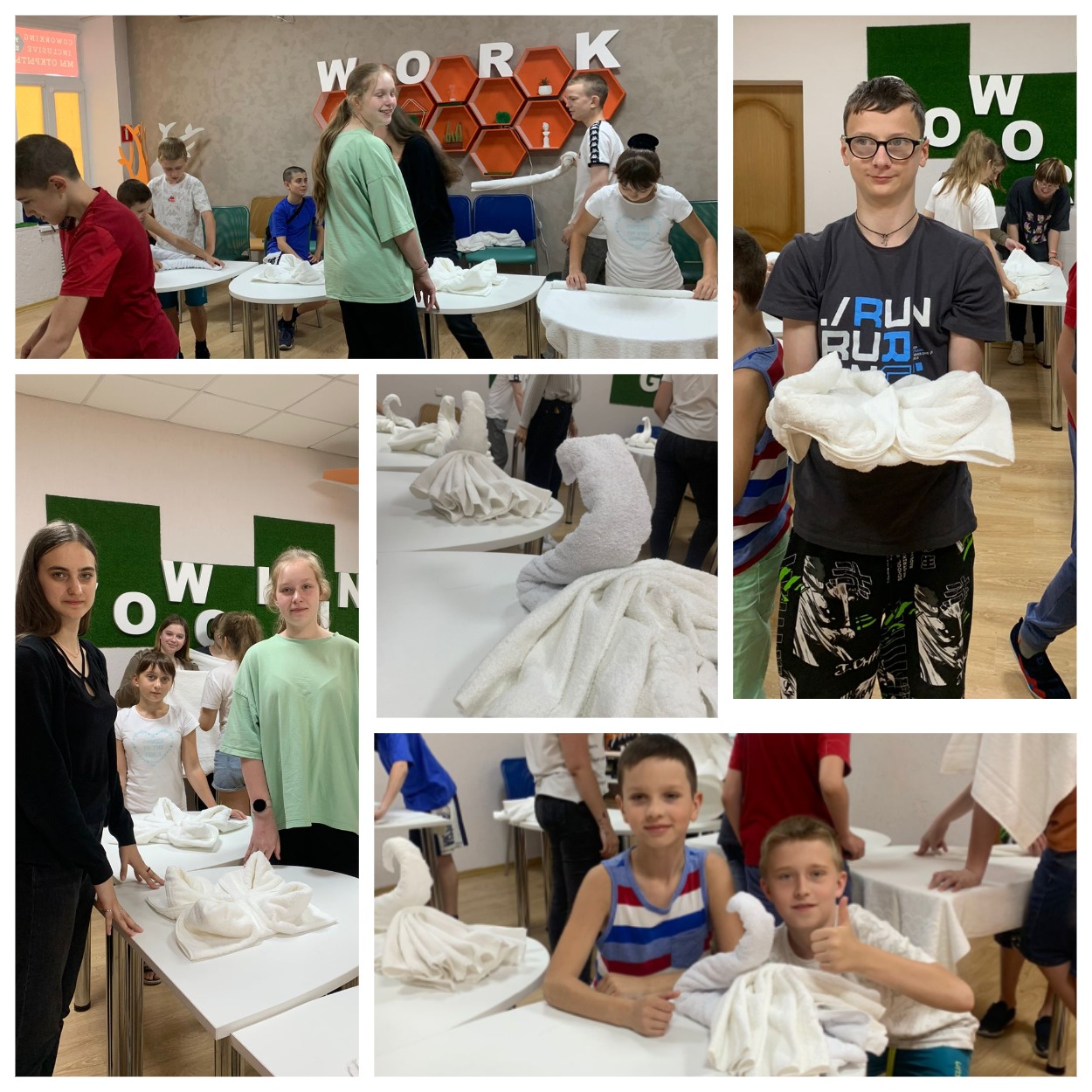 Под руководством студентов и преподавателей НКПТиУ ребята научились формировать красивые (как в первоклассных отелях) фигуры из полотенец. Полотенечные лебеди получились у всех. И хотя делали по одной инструкции, у каждого получился свой, неповторимый.