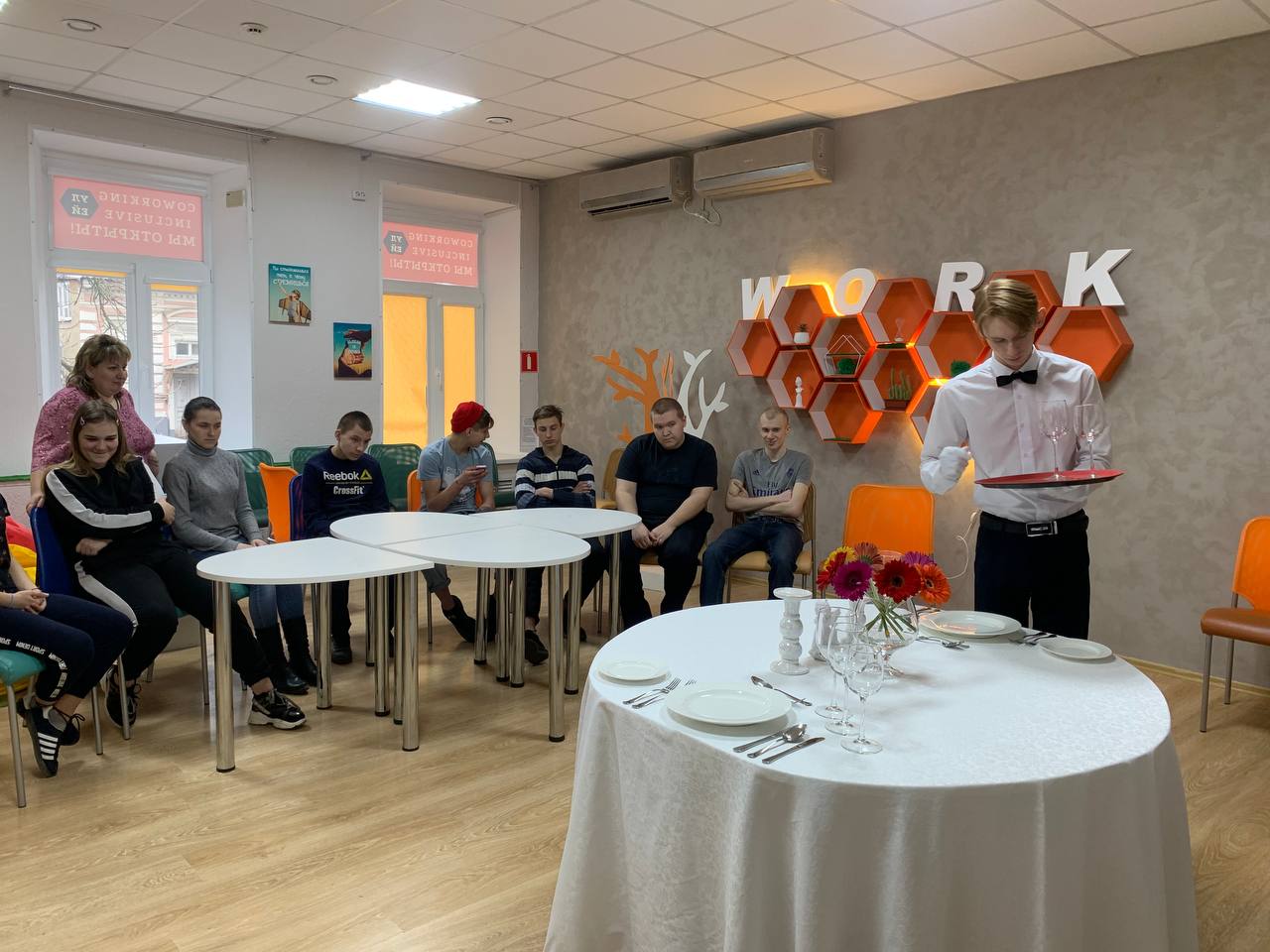 Преподаватель и эксперт Worldskills в компетенции «Ресторанный сервис» Татьяна Скоба организовала мастер-класс «Сервировка праздничного стола». Помогали ей победители чемпионата Worldskills - Андрей Ремезов и Сергей Данилов.