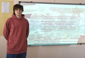 В итоге, первое место в номинации «Казачество в горниле русской революции и Гражданской войны 1918-1920 гг.» занял студент НКПТиУ Кирилл Скляров (группа Ис-201, руководители Иванова Е.В. и Акимова Г.А.) с работой «Люди и судьбы».