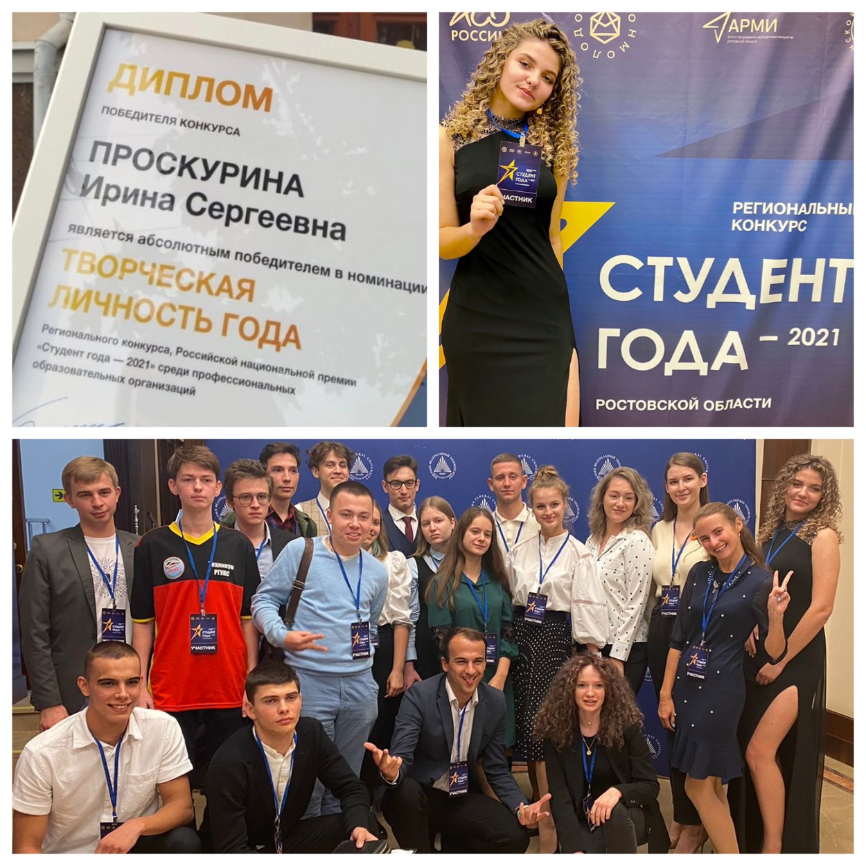 Новочеркаский колледж промышленных технологий и управления представляла Ирина Проскурина. Активная и талантливая, без неё не обходится ни один праздник в НКПТиУ. Поэтому вполне закономерно, что именно наша Ира стала абсолютным победителем регионального этапа Ростовской области в номинации «Творческая личность года»!