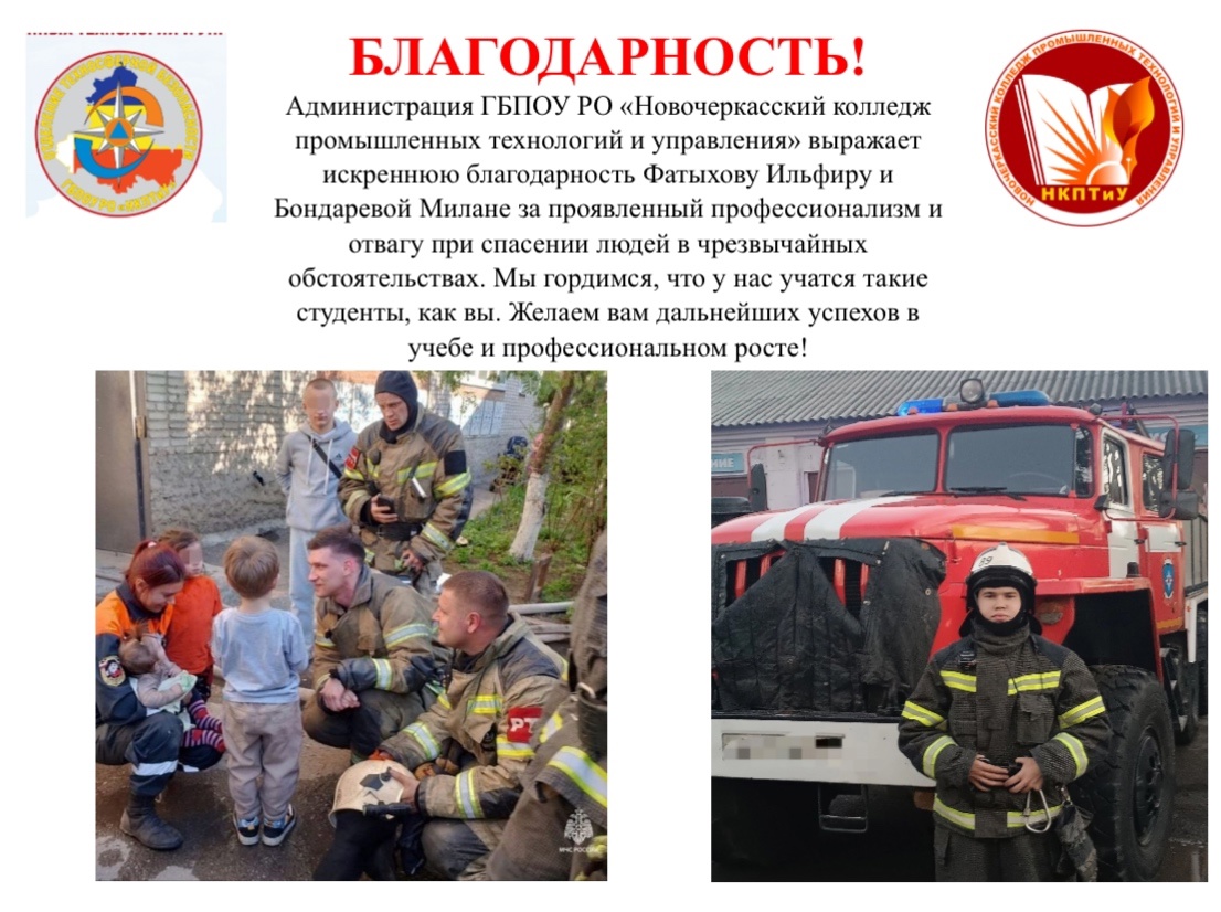 Студенты специальности "Защита в чрезвычайных ситуациях" Новочеркасского колледжа промышленных технологий и управления проявили выдающуюся смелость и профессионализм в экстренных ситуациях. Ильфир Фатыхов, студент и сотрудник 89 пожарно-спасательной части, за два дня совершил два героических поступка: он спас грудничка и бабушку из горящей квартиры в Батайске, а также оказал помощь пострадавшему в ДТП на трассе Ростов-Новочеркасск.