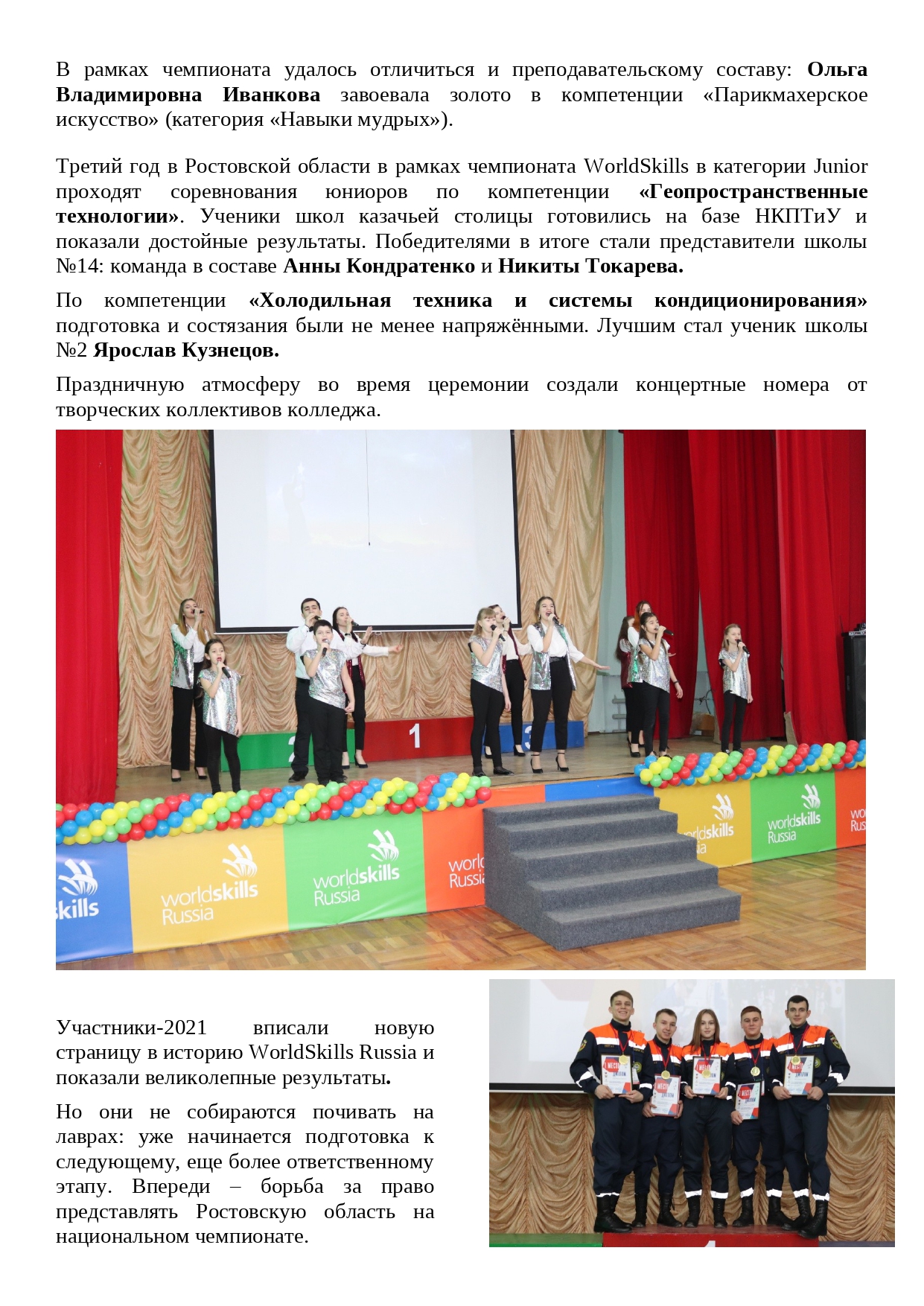 В последний день зимы станут известны имена победителей. Их огласят на торжественной церемонии закрытия. Лучшие молодые профессионалы войдут в состав сборной Ростовской области и смогут защищать честь Донской земли на Национальном чемпионате WorldSkillsRussia в апреле.