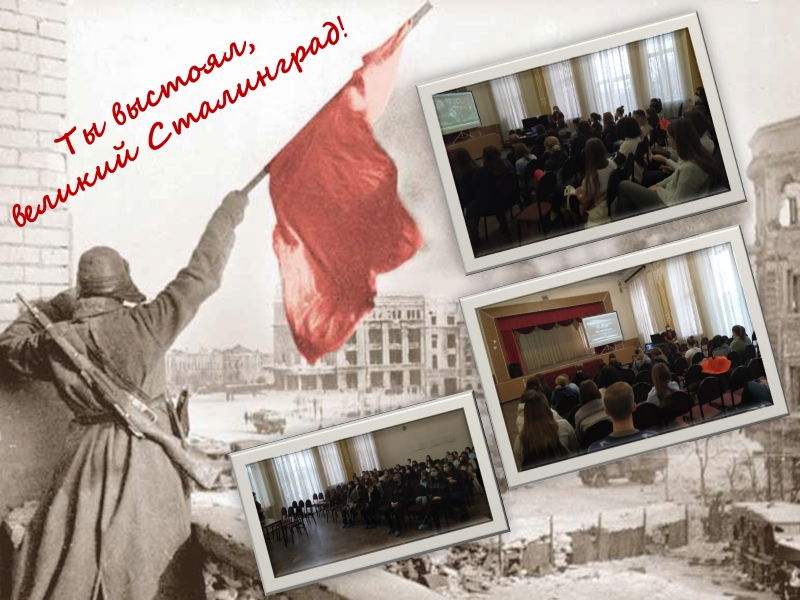 05 февраля 2021 года для групп первого и второго курса специальности «Гостиничное дело» в рамках проведения месячника военно-патриотической и спортивной работы, посвященной Дню защитника Отечества и 76-й годовщины Победы в Великой Отечественной войнев актовом зале корпуса № 4 состоялсямультимедийный урок«Ты выстоял, великий Сталинград!».