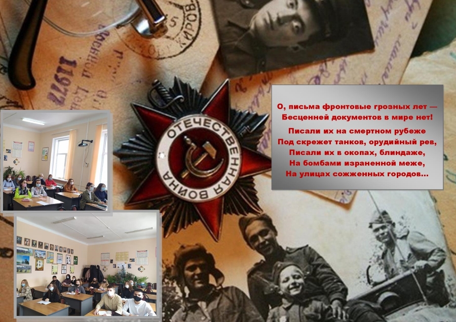 .Письма военных лет хранят память о Великой Отечественной войне. Сохранению этой памяти было посвящено мероприятие «Письма военной поры», проведенноепреподавателем отделения «Экономики и управления»Покидышевой Н.В. в группах Бд-181 и Бд-201. В ходе беседы студенты узнали об истории появления писем – треугольников, о работе полевой почты, о почтальонах, удостоенных высокихнаград. С особым интересом ребята слушалирассказ о собаках, носивших полевую почту,помогавших людям в борьбе с фашизмом.После беседы студенты поделились историями своей семьи, рассказали о том, как в их семьях хранят фронтовые письма. В семьях писем ждали больше, чем воды и хлеба в голодные военные годы, о них втайне просили Бога и тихонько плакали.