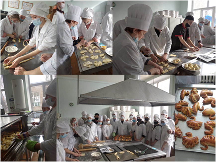«Наставники» школьников, студенты группы ПК–171 Царапкин Дмитрий и Додица Алексей, продемонстрировали ребятам варианты формования детской фигурной сдобы, плетеных изделий, булочных изделий с начинкой и без неё, а наши гости выполнили авторские плетеные изделия своеобразной формы, изделия «Чебурашка» и «Колесо Мерседеса» с отделкой поверхности изделий смесью мака с сахаром и повидлом.