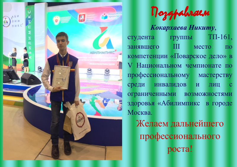 Студент колледжа Кокархаев Никита по компетенции «Поварское дело» успешно прошел отборочный этап и на Национальном чемпионате занял 3-е место. Поздравляем!!!