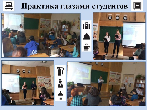 К итоговой конференции студенты подготовили компьютерные презентации о базах практики и видах работ, выполняемых ими в различных структурных подразделениях предприятия, с демонстрацией фотографий. В ходе конференции будущие специалисты гостиничного сервиса рассказали о том, что нередко им приходилось использовать свои теоретические знания при выполнении конкретных поручений специалистов предприятий, какие новые профессиональные навыки они получили и какие проблемы решались ими в ходе практики.