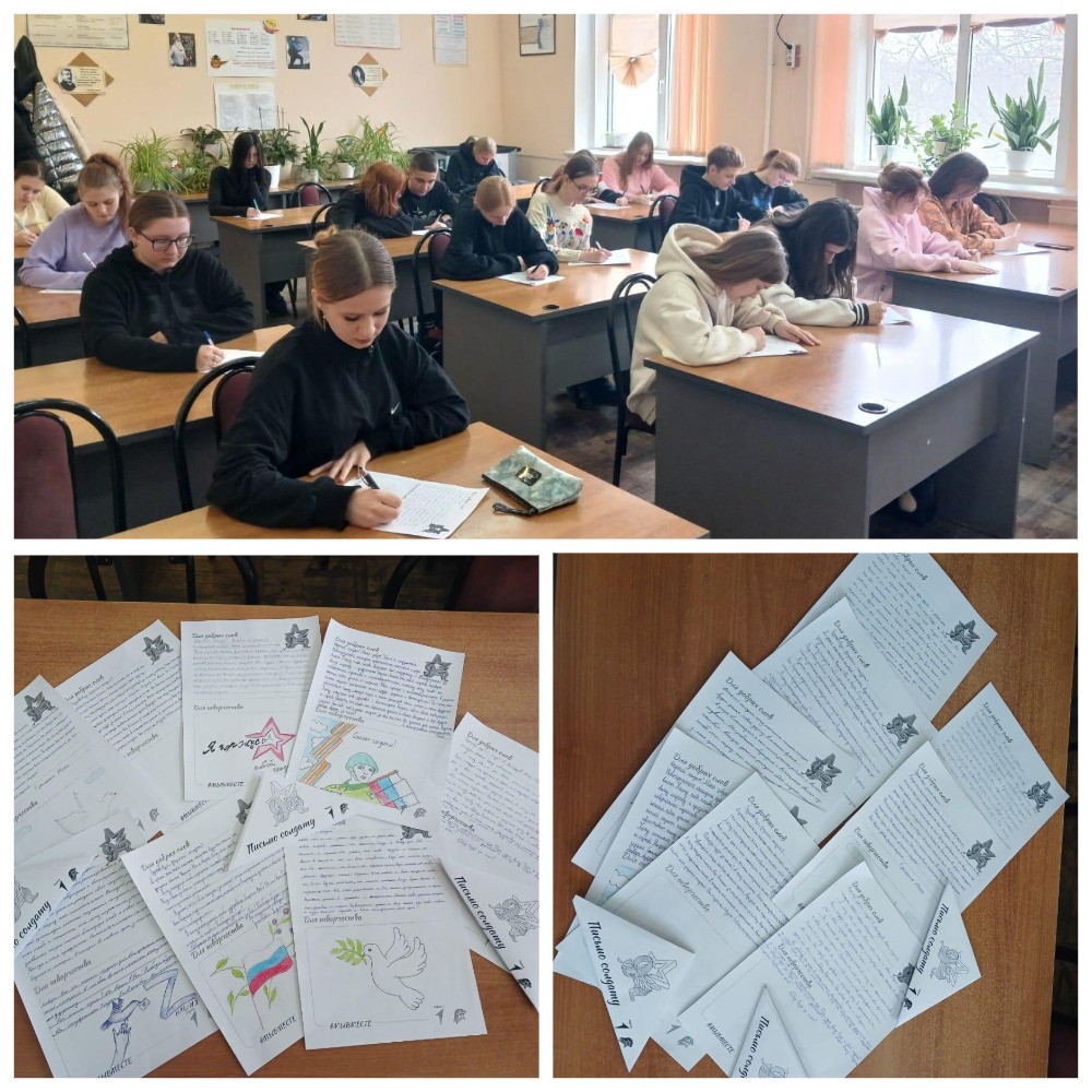 Все группы первого курса вместе с классными руководителями написали письма участникам специальной военной операции, в которых выразили признательность и благодарность за героическое служение Родине. Написали множество тёплых слов и поздравления настоящим мужчинам, которые отстаивают интересы нашей огромной страны ценой собственной жизни. Пожелания были однозначными - вернуться домой целыми и невредимыми, с Победой!