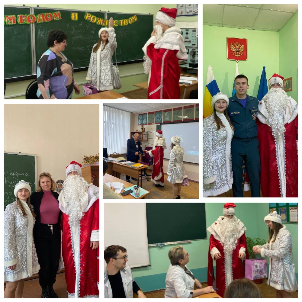 Студенты колледжа, ребята первичного отделения Российского движения детей и молодёжи организовали поздравление, которое оценили абсолютно все! В костюмах Деда мороза и Снегурочки активисты побывали во всех учебных корпусах, поздравили студентов, преподавателей и сотрудников с нступающим Новым годом, вручили небольшие сладкие подарочки, произнесли множество добрых слов, пожеланий и комплиментов.