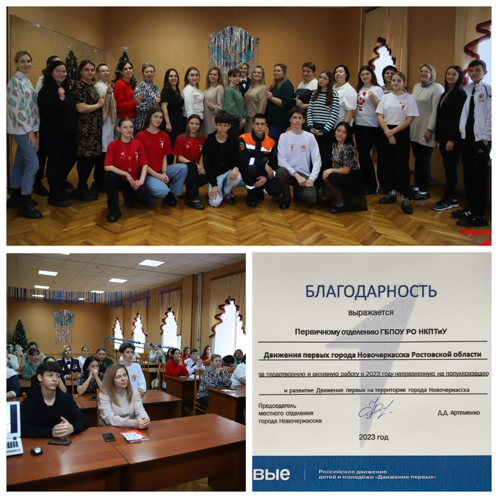 Первичное отделение Новочеркасского колледжа промышленных технологий и управления было удостоено благодарственного письма за плодотворную и активную работу в 2023 году, направленную на популяризацию и развитие Движения на территории города Новочеркасска.