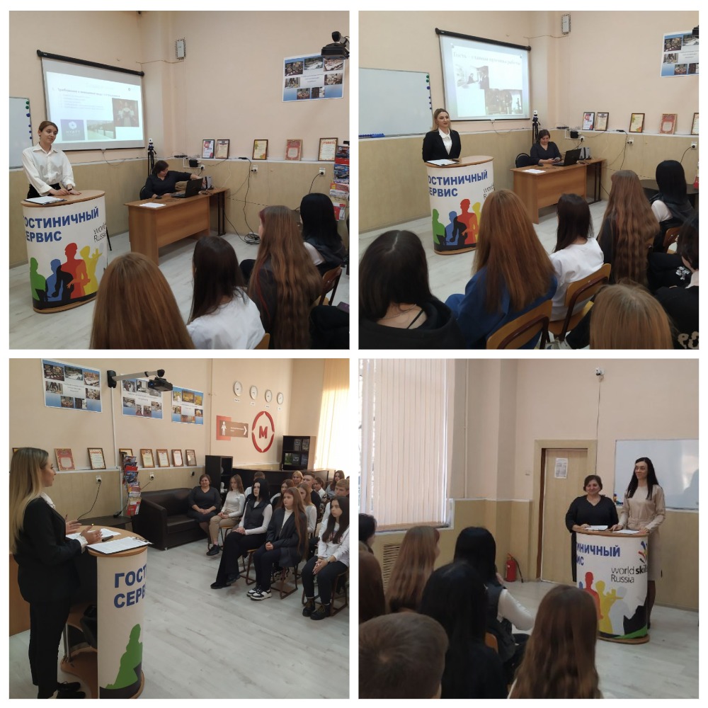Студентка четвертого курса специальности «Гостиничное дело» Ксенья Хлыстунова представила презентацию и подробно рассказала ребятам о требованиях к внешнему виду и поведению сотрудников контактных служб в пятизвездочном отеле «Гранд Ростов Хаятт Ридженси», в котором девушка неоднократно проходила производственную практику.